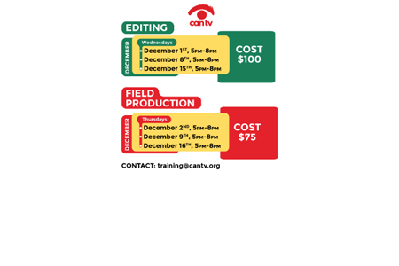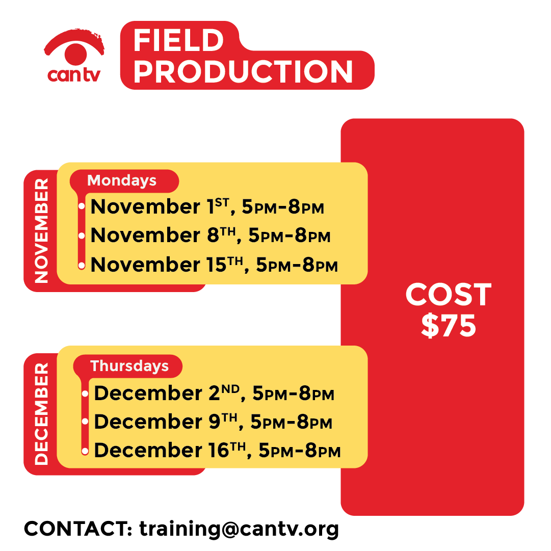 CAN TV Fall 2021 Training Schedule Field Class – $75 Three 3-hour sessions will give you the hands-on experience and skills to use a portable digital video camera, audio equipment, lights, and more. (cancelled) Monday, November 1st, 8th & 15th from 5-8 pm Thursday, December 2nd, 9th & 16th from 5-8 pm … View Article